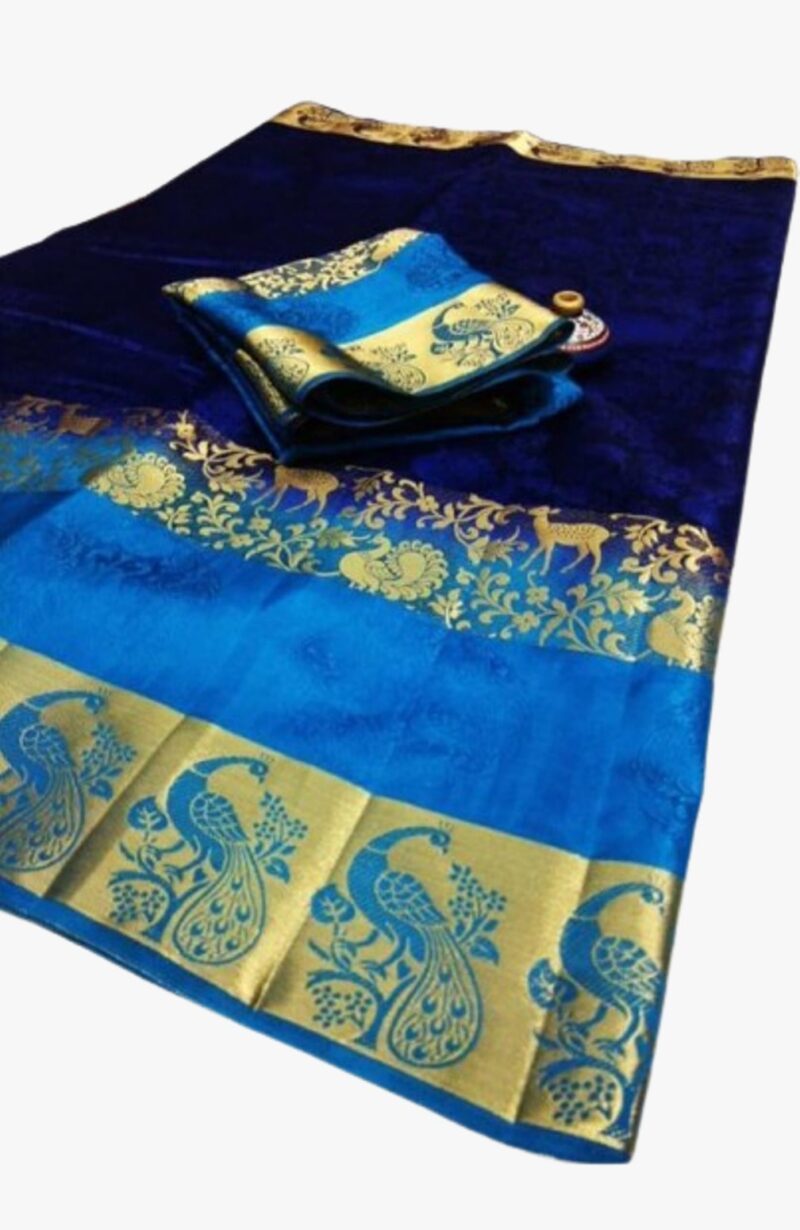 This blue self design saree looks elegant with peacock design on border. It comes With Blouse which has same design as saree.